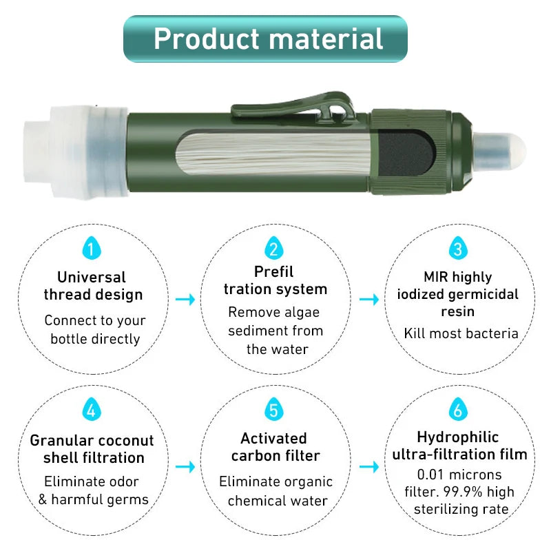 Triple Filtration: The combination of a sediment pre-filter, a 0.01 micron membrane filter straw and activated carbon fiber removes all visible solids, reduces 99.99999% of hazardous substances and improves odor, giving you the safest water source in the worst environments.